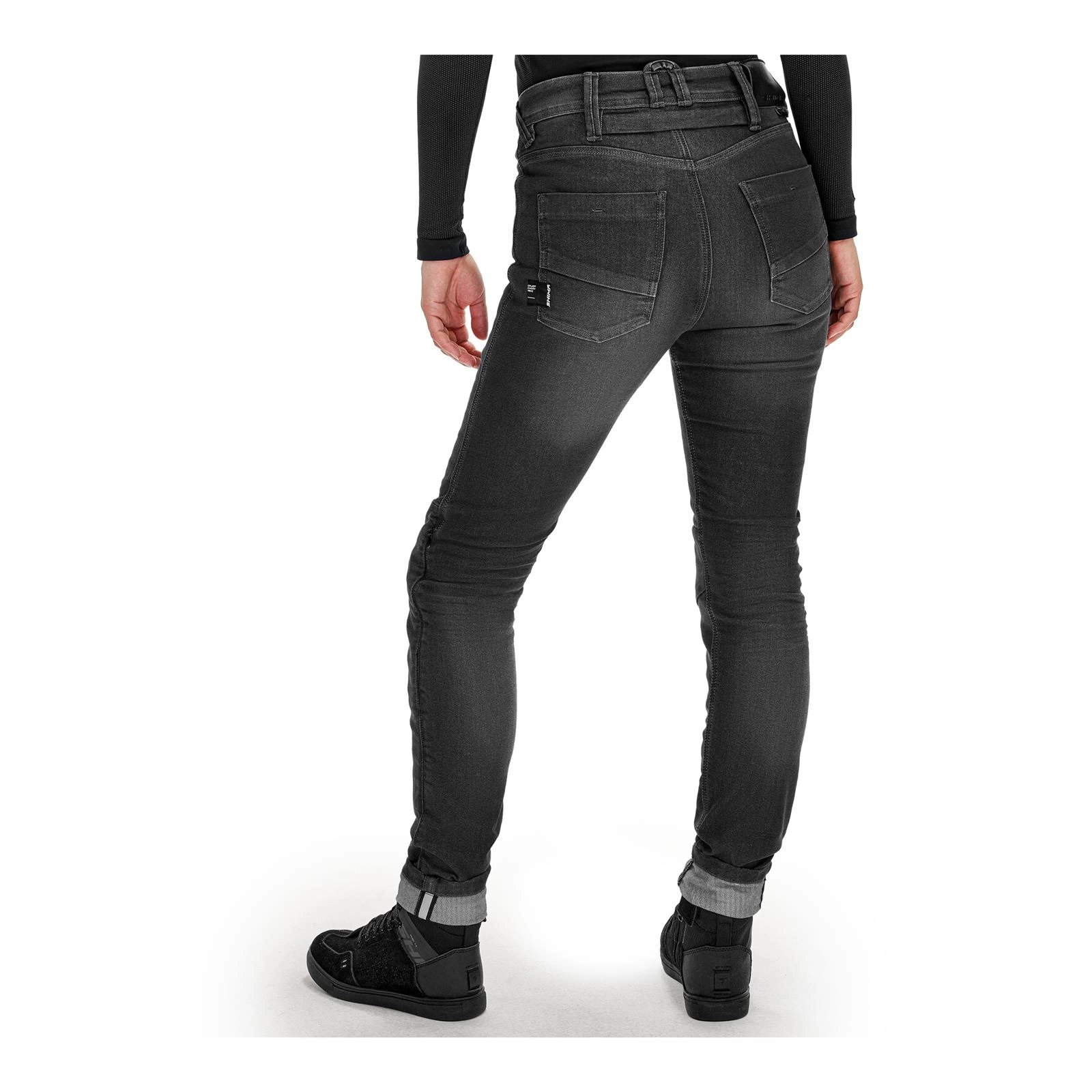 Subtelne elementy odblaskowe są widoczne po wywinięciu nogawek, zwiększając widoczność w trudnych warunkach oświetleniowych. Pętelka oraz krótki zamek, łączące damskie jeansy z kurtką Shima, umożliwiają stworzenie idealnie dopasowanego zestawu. Karabińczyk pełni funkcję praktycznego dodatku, który może posłużyć do przypięcia kluczy czy innych niezbędnych drobiazgów. Dodatkowo damskie jeansy posiadają klasyczne przednie kieszenie wzbogacone o małą kieszonkę na monety oraz dwie przestronne kieszenie z tyłu.